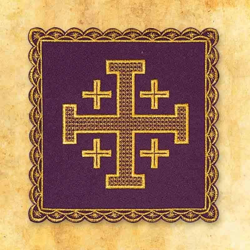 The purple embroidered pall No. 19 is an elegant element of chalice linen, made of high-quality liturgical fabric in a deep purple color. Decorated with gold embroidery depicting the Jerusalem cross, it symbolizes faith, redemption, and the spiritual unity of the Church. The classic pattern with rich symbolism gives the whole piece a solemn and sacred character.
