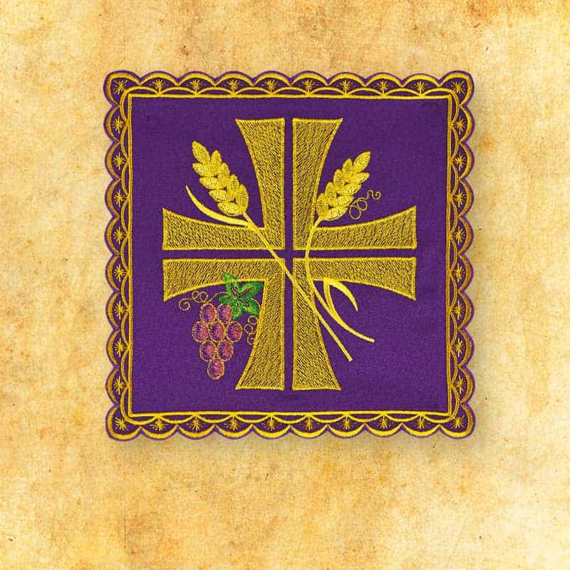 Purple embroidered palka No. 47 is an elegant element of chalice linen, made of high-quality purple liturgical fabric. Decorated with gold embroidery depicting a cross, ears of grain, and grapes, it symbolizes the Eucharist—the Body and Blood of Christ—as well as spiritual transformation and rebirth in faith.Each Purple Embroidered Palk No. 47 is made in the workshop of Urbanowicz Haft Polska, where a long tradition of sacred embroidery is combined with craftsmanship precision and an artistic approach to detail. The use of high-quality threads, decorative trimmings, and durable fabric guarantees not only a beautiful appearance but also the longevity of the product.The purple color symbolizes penance, reflection, and anticipation, making the staff ideal for Lent and Advent. It is a unique combination of spiritual meaning, elegance, and traditional craftsmanship that emphasizes the solemn nature of any liturgical celebration.n