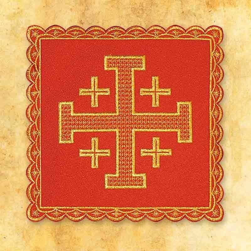 Embroidered red pallium No. 1 is an elegant element of chalice linen, made of high-quality liturgical fabric in a deep red color. Decorated with gold embroidery depicting the Jerusalem Cross, it symbolizes the five wounds of Christ and the universal proclamation of the Gospel. For centuries, this pattern has been a sign of faith and the missionary message of the Church. Each embroidered pall is made in the Urbanowicz Haft Polska workshop.gt;embroidered pallet is created in the workshop of Urbanowicz Haft Polska, where the tradition of Polish sacred embroidery is combined with modern precision of workmanship. The use of durable fabric, gold thread, and decorative trim ensures not only an aesthetic appearance but also exceptional durability.The red color, symbolizing the Holy Spirit, fire, and martyrdom, makes this pallet the perfect choice for Masses for martyrs, Pentecost celebrations, and feasts associated with the Blood of Christ. The embroidered red staff No. 1 combines spiritual symbolism, tradition, and craftsmanship, emphasizing the solemn nature of the liturgy.lt;/p>
