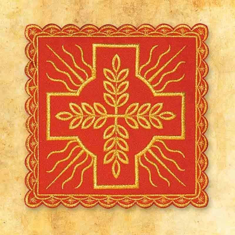 Red embroidered palka No. 4 is a unique element of chalice linen, made of high-quality liturgical fabric in an intense red color. Decorated with gold embroidery depicting a cross with a leaf motif and rays of light, it symbolizes life, sacrifice, and the power of the Holy Spirit. The combination of red and gold emphasizes the solemn nature of every celebration.Each embroidered pall is made in the workshop ofUrbanowicz Haft Polska, where the tradition of sacred craftsmanship meets modern embroidery techniques. The fabric’s elegant structure, decorative trim, and gold thread embroidery ensure durability, functionality, and aesthetics of the highest quality.lt;/p>