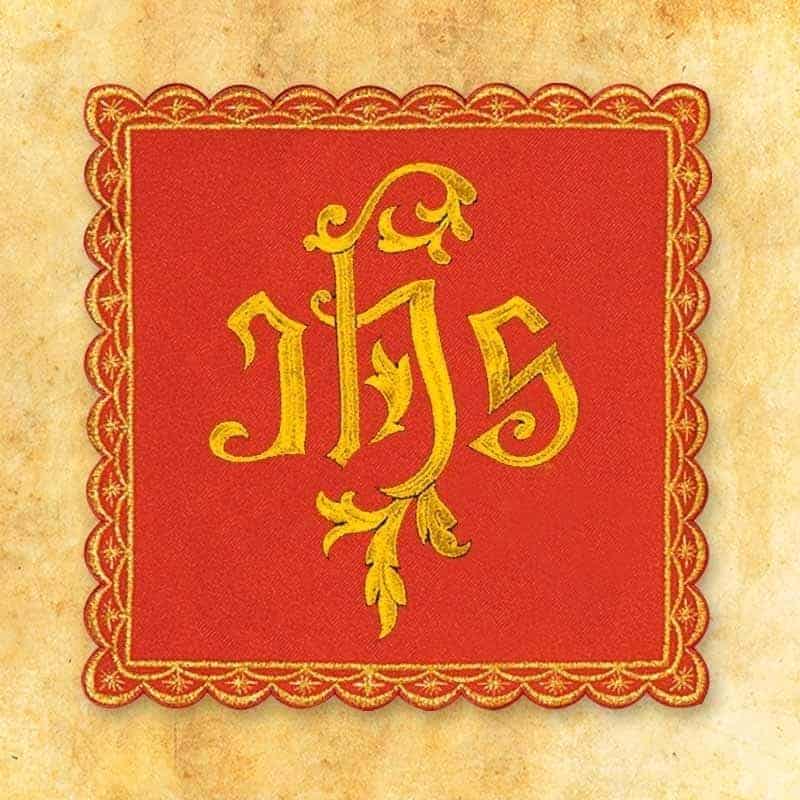 Red embroidered palka No. 6 is an elegant element of chalice linen, made of high-quality liturgical fabric in a deep shade of red. Decorated with gold embroidery depicting the monogram IHS – the symbol of the name of Jesus Christ – it emphasizes the spiritual depth and significance of the Eucharist.Each Red Embroidered Chalice Cover No. 6 is made in the workshop of Urbanowicz Haft Polska, where the tradition of sacred embroidery meets craftsmanship precision and attention to every detail. The fabric with its elegant texture, golden threads, and decorative trim create a harmonious whole with a unique liturgical character.The red color of the pall symbolizes the Holy Spirit, love, martyrdom, and sacrifice, making it ideal for celebrations related to Pentecost, martyrs’ feasts, and other special liturgies. It is a combination of spiritual meaning, aesthetics, and the highest quality craftsmanship.n