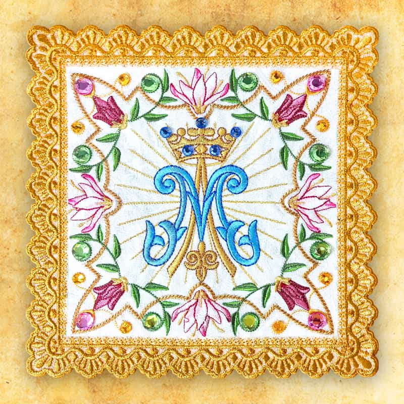 The embroidered pall “Pretiosus” is an elegant element of chalice linen with a unique Marian character. At the center of the composition is a blue monogram “M” topped with a crown, symbolizing the Blessed Virgin Mary – Queen of Heaven. Around the main motif are rays of light and lilies and roses, which in Christian tradition signify purity, beauty, and spiritual perfection.lt;/p>