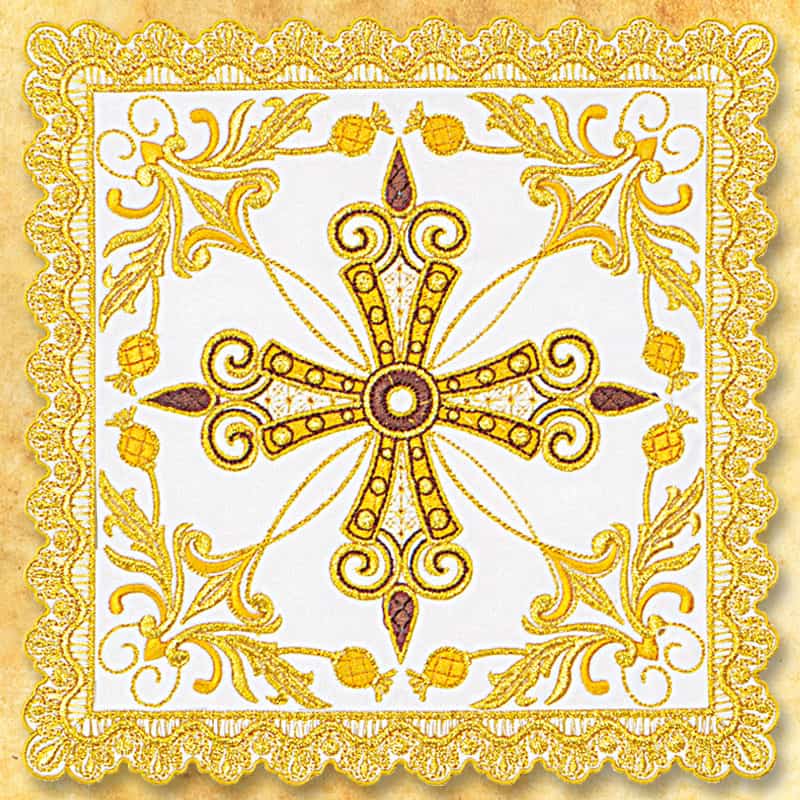 A pall richly embroidered with gold thread is a unique element of chalice linen, combining elegance with deep liturgical meaning. Made of high-quality white fabric, it is decorated with elaborate embroidery in shades of gold and bronze, creating a striking cross motif surrounded by stylized floral ornaments. Every detail has been crafted with the utmost precision, giving the pallet a refined and symmetrical design. The fabric is durable, smooth, and crease-resistant, ensuring it retains its impeccable appearance for a long time. Delicate lace trim provides an elegant finish, adding lightness and a sense of handcrafted artistry. This pall is perfect for solemn Masses, adoration and holiday celebrations, emphasizing the sacred nature of the liturgy.