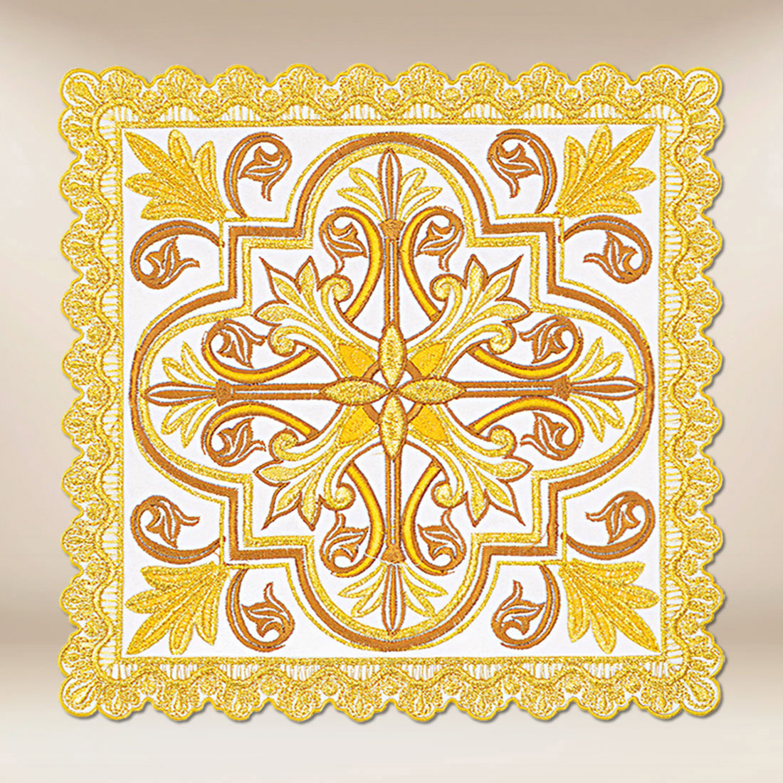 A pad richly embroidered with gold thread is a unique element of chalice underwear that combines beauty, symbolism, and the precision of handcraftsmanship. Made of high-quality ecru fabric, it is decorated with striking embroidery in shades of gold and bronze, creating a symmetrical, floral ornament with a classic character. Every detail of the design emphasizes the dignity of the liturgy and the harmony of forms inspired by sacred art. The fabric is durable, resistant to creasing, and drapes beautifully, ensuring an elegant look for many years to come. The gold thread used in the embroidery subtly shimmers in the light, giving the pallet a unique shine and a solemn tone. The whole is finished with delicate lace, which adds lightness and finesse.