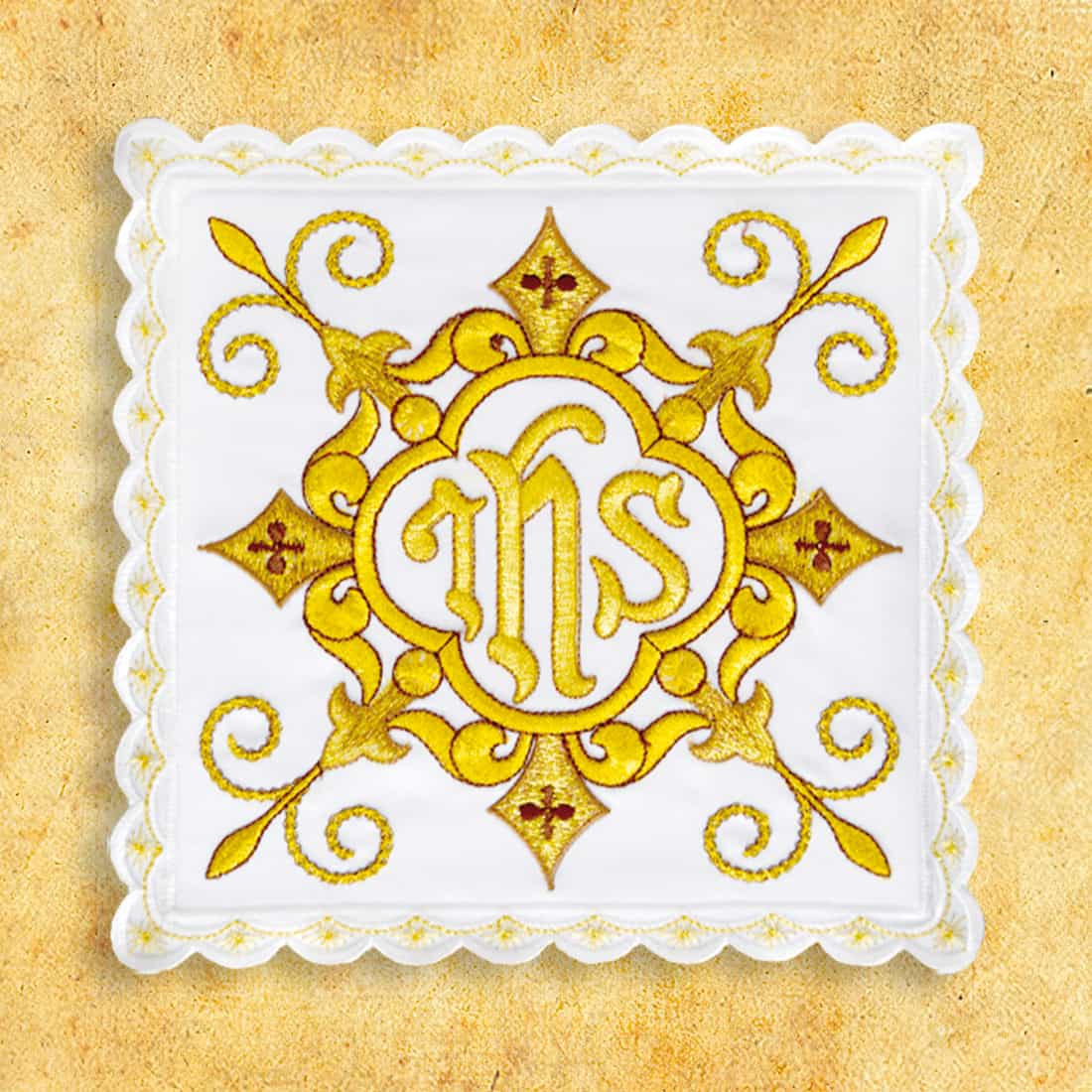 White embroidered palka no. 15 is an elegant and richly decorated element of chalice linen, made of high-quality white liturgical fabric. The central motif is a golden IHS monogram, surrounded by a symmetrical ornamental composition in a classical style. The golden threads used in the embroidery give the whole piece a solemn and noble appearance, while the white fabric symbolizes the purity and holiness of the Eucharist.lt;/p>