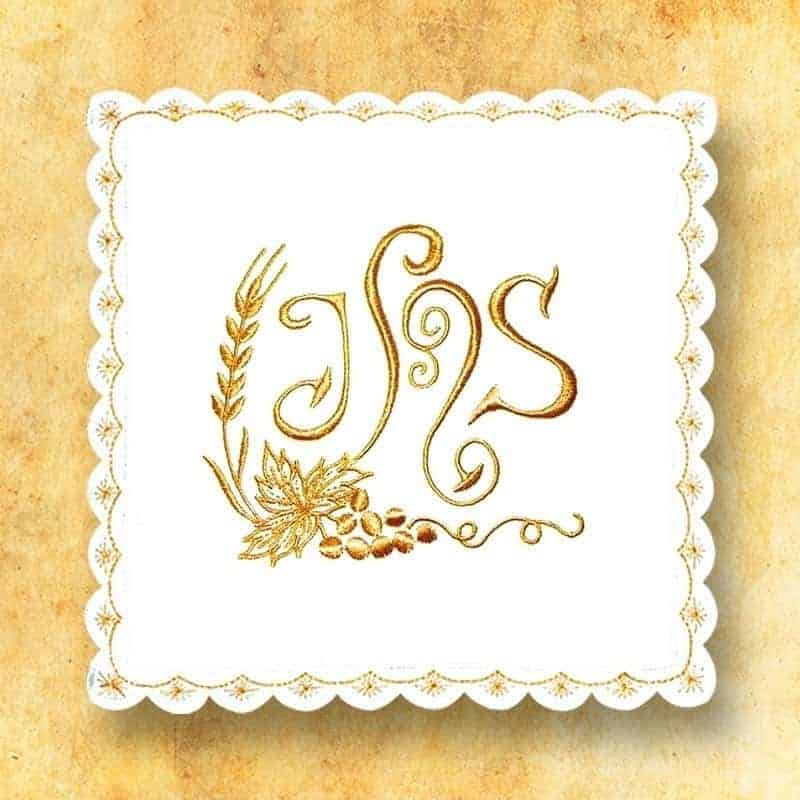 The white embroidered palka no. 29 is a classic and elegant element of chalice linen, distinguished by delicate embroidery depicting the IHS monogram surrounded by a motif of ears of grain and vines. This symbolism refers to the Eucharist – the Body and Blood of Christ – and is a profound expression of faith and spiritual focus during the liturgy.Made of high-quality white liturgical fabric, the pall combines durability with subtle aesthetics. It is decorated with precise embroidery made with gold thread, which shimmers beautifully in the light of the altar. The edges are trimmed with lace edging with a classic pattern, giving the whole piece lightness and unique charm. The fabric is crease-resistant and easy to maintain, which means that the product retains its impeccable appearance for a long time.