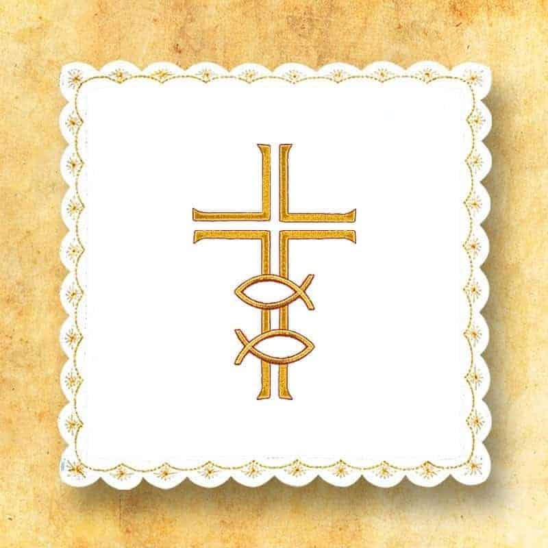 White embroidered pallium no. 27 is a unique element of chalice linen, distinguished by its minimalist yet deeply symbolic embroidery. The central motif is a cross with two fish – an ancient symbol of Christianity, which from the earliest centuries has been the hallmark of the faith and community of Christ’s disciples. The golden embroidery symbolizes divine light, eternity, and the spiritual richness of the liturgy. The pallium is made of high-quality white liturgical fabric, ensuring durability and resistance to creasing. Subtle lace trim surrounds its edges, adding lightness and elegance to the whole. Carefully selected metallic threads emphasize the precision of workmanship and aesthetics of the embroidery, thanks to which the pectoral cross retains its perfect appearance even after repeated use.