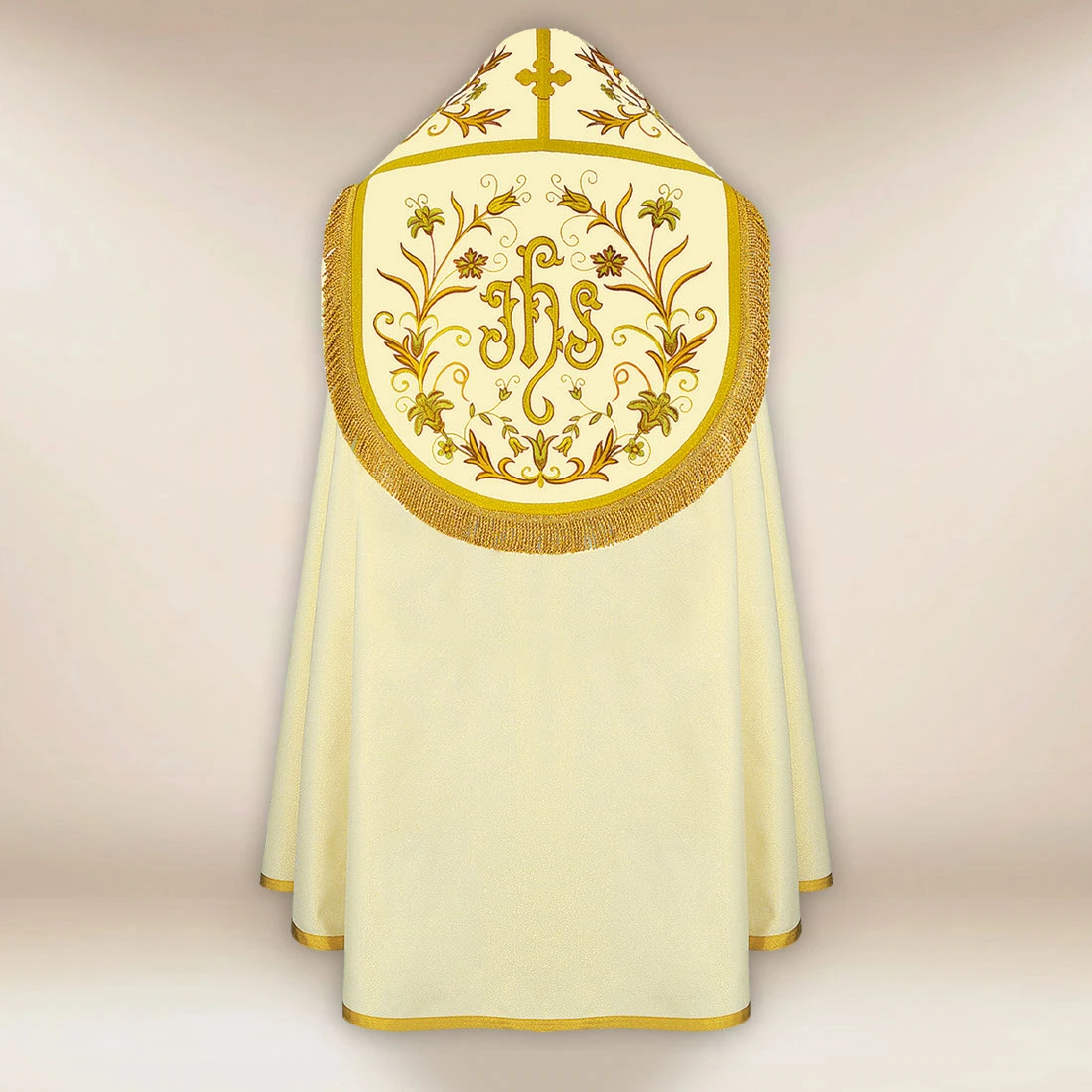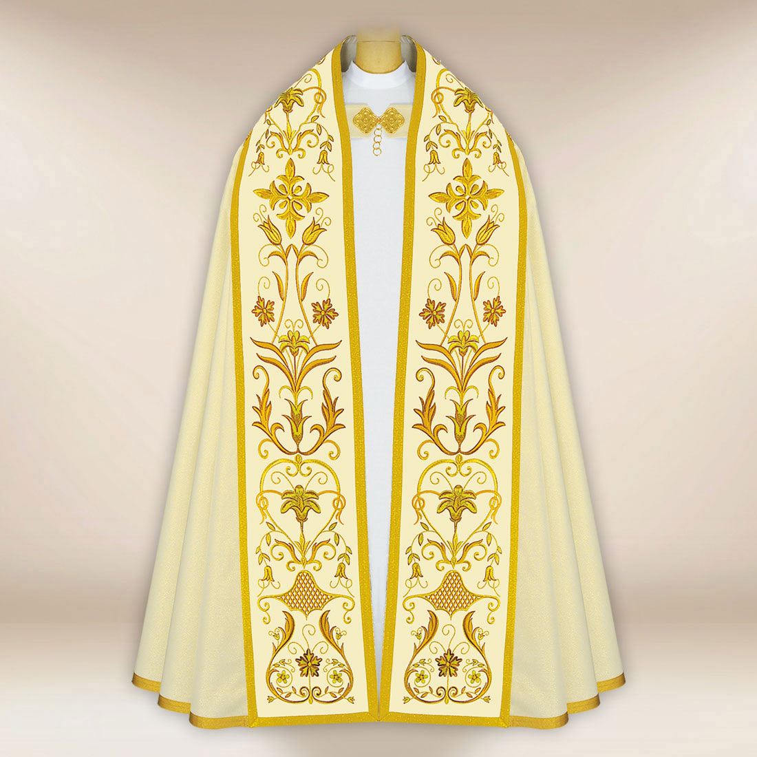 The fabric is a blend of natural and synthetic fibers, which ensures durability, breathability, and comfort. />Subtle embroidery and precise finishing emphasize the liturgical character of the cope, combining classic form with modern workmanship.