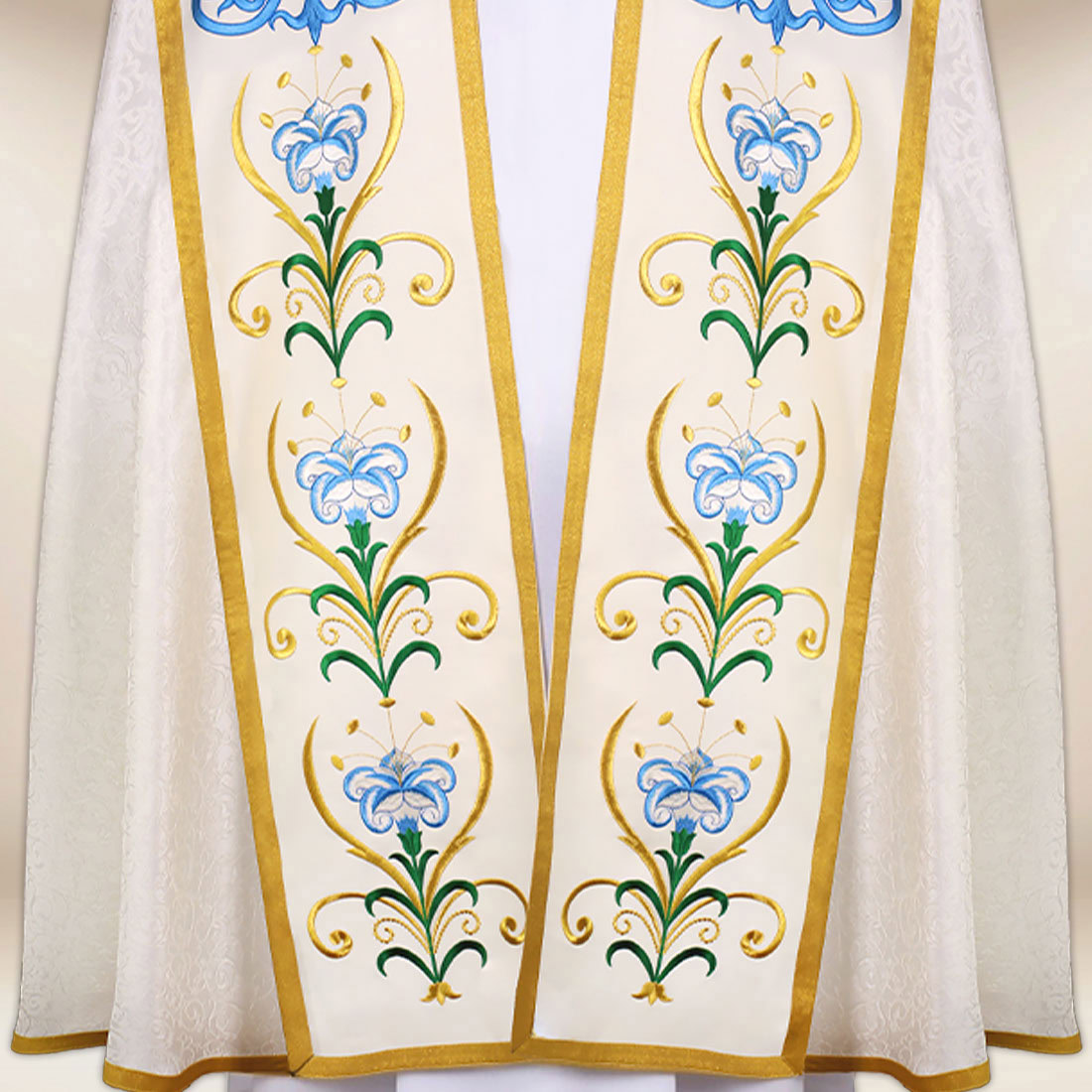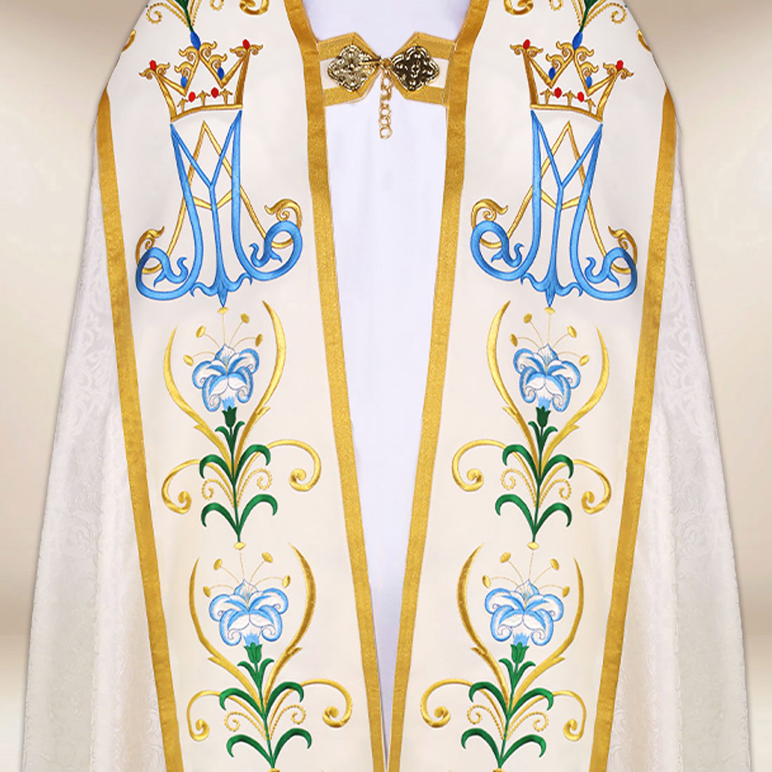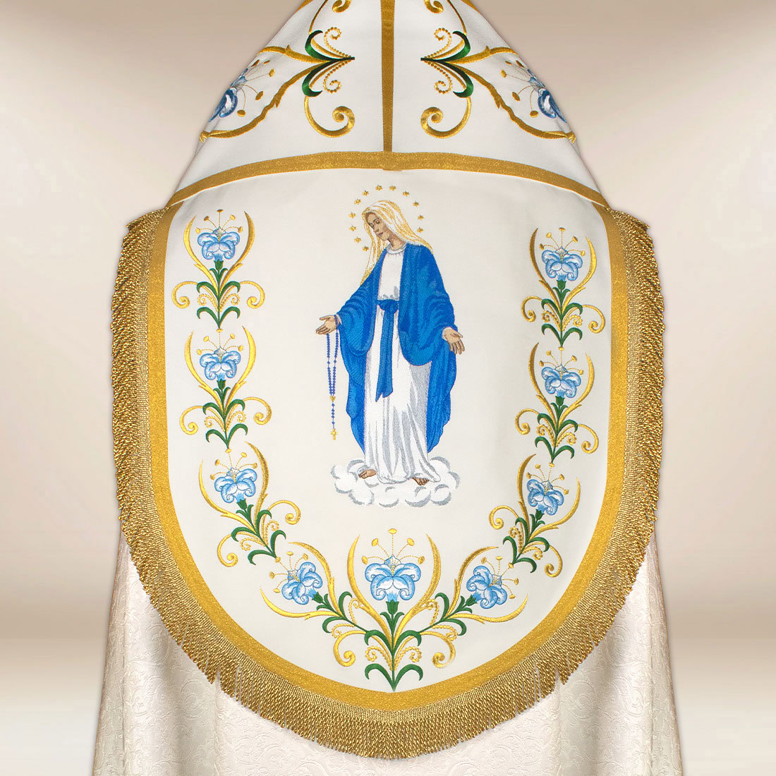 Liturgical cope with the motif of Our Lady of the Rosary has been created for solemn Marian celebrations, processions, and services where a dignified and beautiful setting is particularly important. The garment is made from high-quality jacquard fabric in an elegant ecru shade, distinguished by its subtle texture and natural sheen. Its soft draping adds harmony during movement, while the lightweight material ensures comfort during longer services.