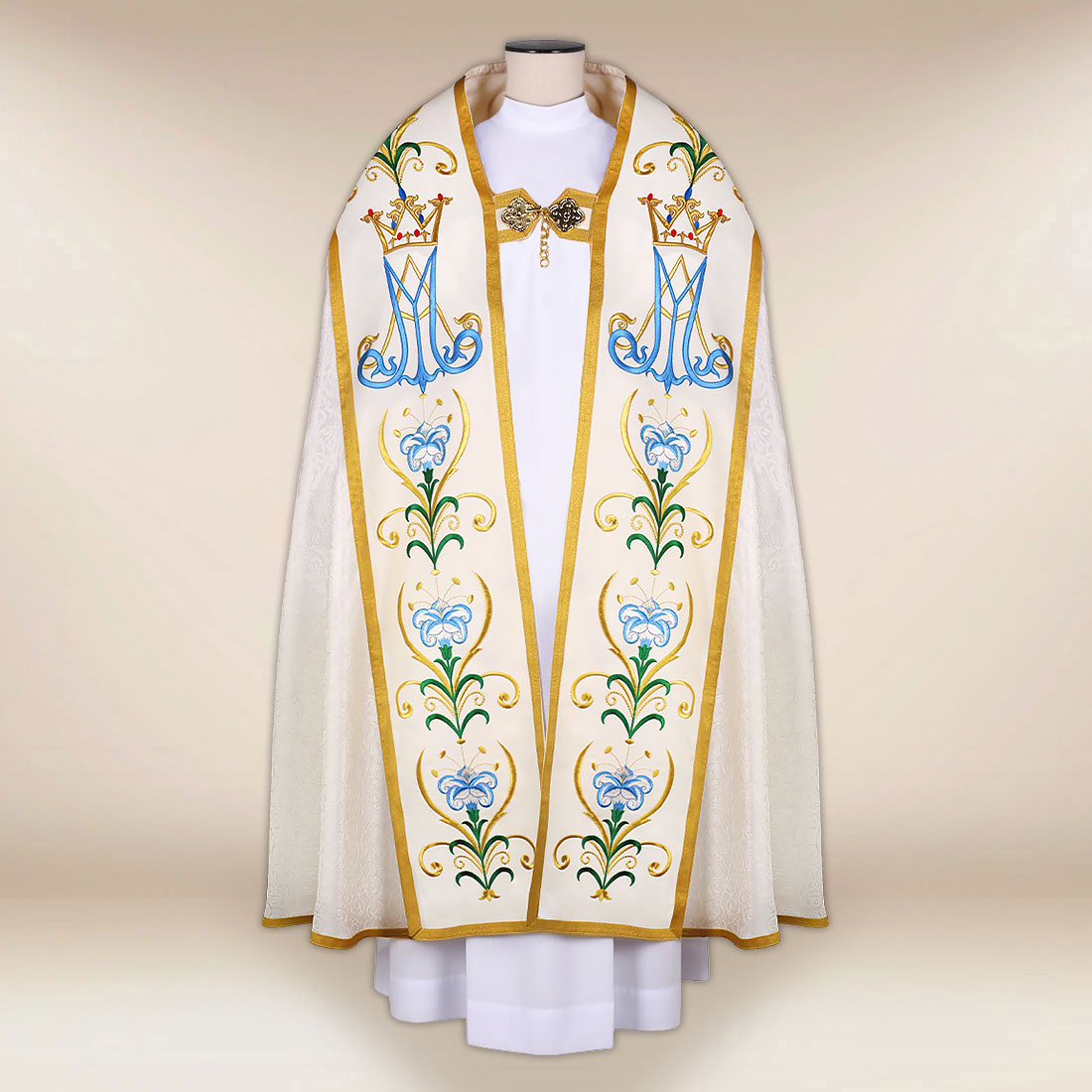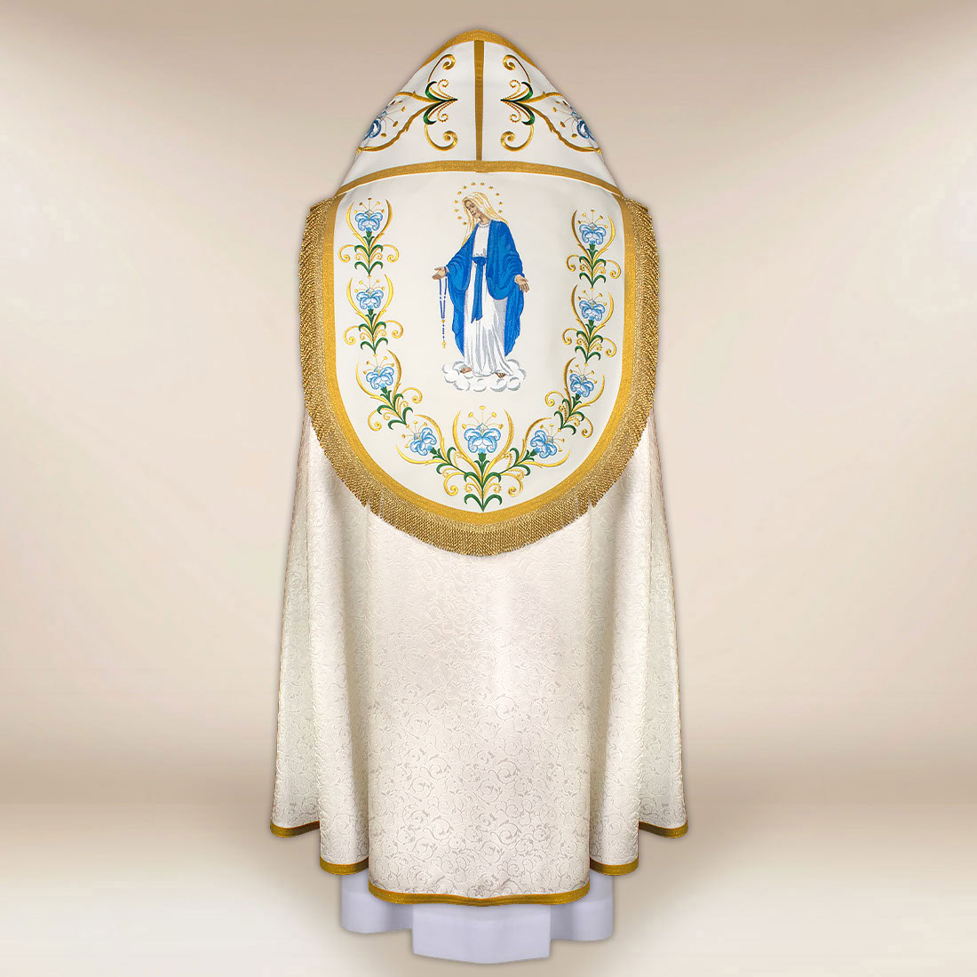 The central point of decoration is a rich, carefully embroidered image of Our Lady, surrounded by an intricate floral and ornamental composition. The embroidery emphasizes the spiritual character of the garment while giving it a unique aesthetic suitable for the most important liturgical celebrations. The cope is trimmed with golden passementerie, which completes its festive appearance and highlights the Marian character of the design.