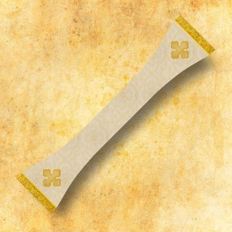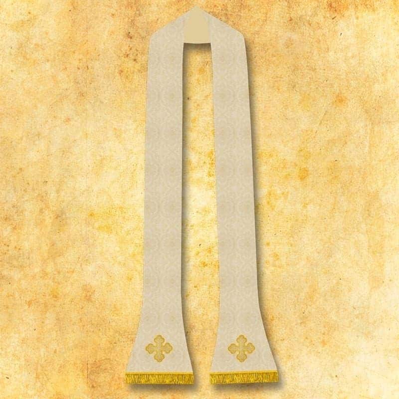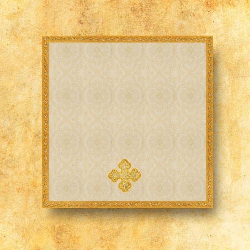 Modern technology for transferring photographs onto fabric.Excellent quality, durability, realistic colors.The chasuble is made of high-quality fabric interwoven with gold or silver thread, a blend of natural and polyester fibers. The chasubles are slightly stiffened and lined with viscose and satin in a color matching the chasuble. The chasuble is exceptionally light. One size fits all.nLength:- front 98 cm (+-2 cm) from the shoulder to the bottom of the chasuble- back 110 cm (+-2 cm) from the shoulder to the bottom of the chasubleThe set consists of a chasuble, stole, maniple, veil for the chalice and burse