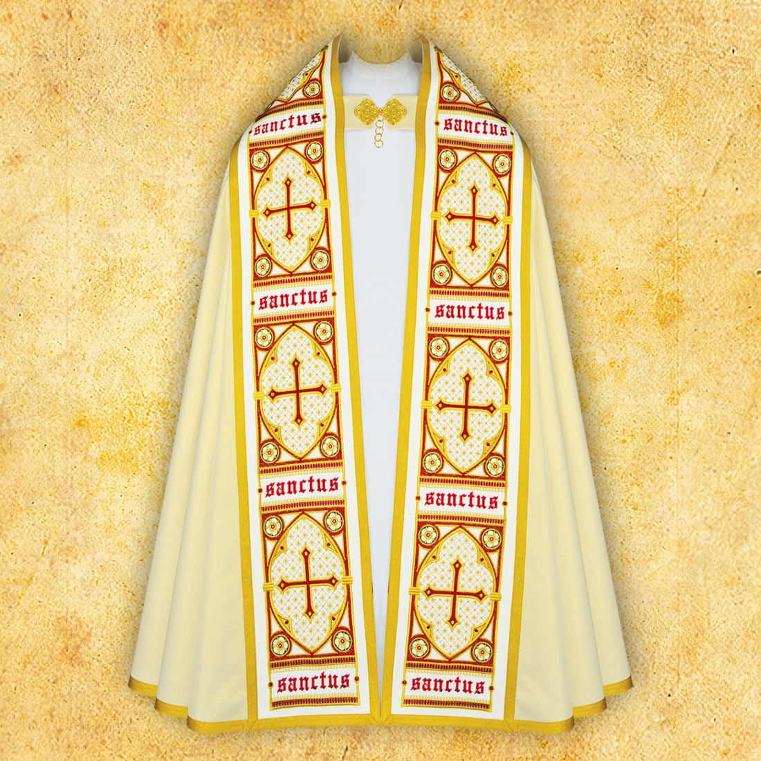 Embroidered liturgical chasuble made of high-quality satin fabric, which combines natural and synthetic fibers, making it soft, elegant, and comfortable to wear. Perfect for solemn celebrations and processions.The collar and braids are decorated with rich gold thread embroidery, emphasizing the dignified character of the garment. The whole is finished with Italian trimmings in the color of old gold. The set includes a matching inner stole. One size fits all – suitable for every priest.