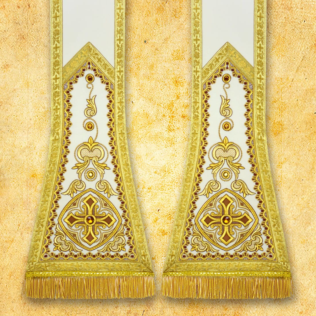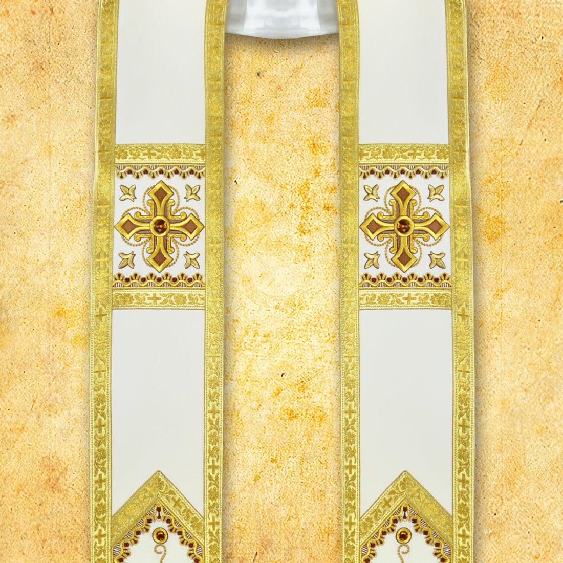 Liturgical Roman stole made of high-quality “Satinowool” fabric. The material is soft, delicate, and elegantly draped, combining natural and synthetic fibers.The stole is richly embroidered with gold thread and hand-decorated with stones, which gives it a unique, liturgical character. The whole is complemented by Italian braid in old gold color. Perfect for solemn church celebrations. The price of each stole includes 2 laser-cut collars.