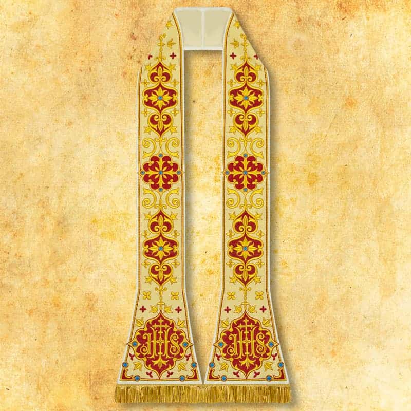 The embroidered Roman stole with the IHS symbol is a unique liturgical vestment for priests, combining classic elegance with the highest quality workmanship. />It is made of high-quality fabric with a soft texture, which drapes beautifully and ensures complete comfort during long celebrations.