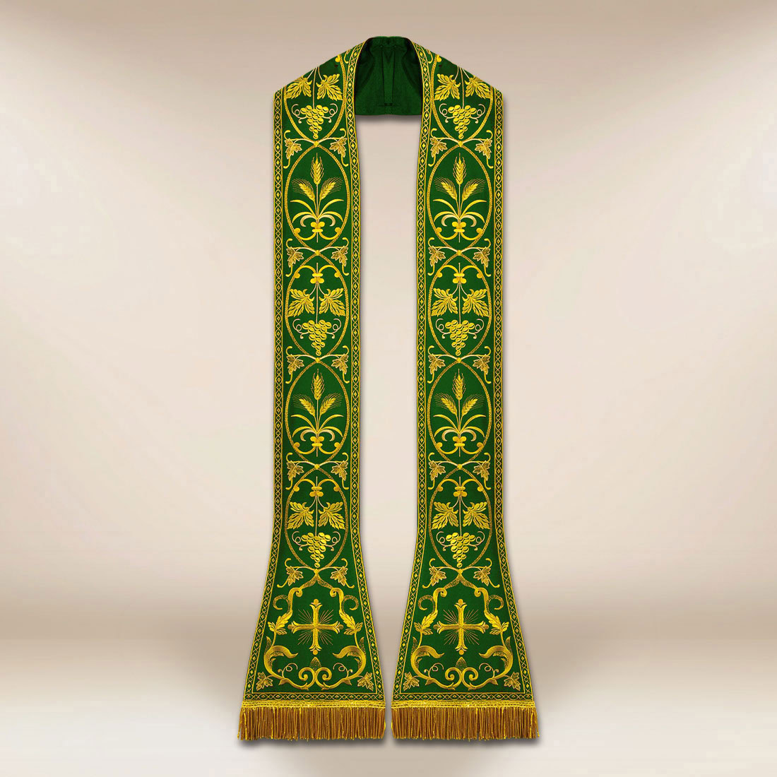 The lower part of the stole is adorned with an embroidered cross, serving as a visual and theological complement to the whole. The embroidery made with gold thread subtly contrasts with the deep green of the fabric, giving the garment a solemn character. The fabric is soft, durable, and aesthetic, allowing the stole to drape naturally during movement while maintaining its elegant appearance.
