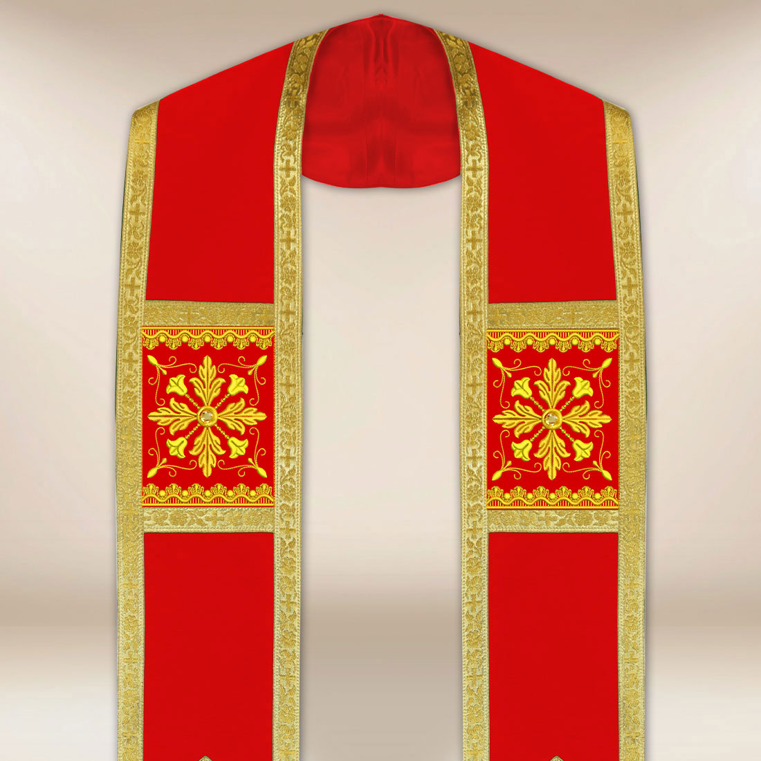 The red embroidered Roman stole presented here is made from “Satinowool” fabric, which combines the softness of natural fibers with practical durability. Its surface is delicate, pleasant to the touch, and the stole drapes harmoniously without creating unsightly creases. During celebrations, the red Roman stole maintains an elegant line and does not restrict movement, which is important during longer liturgical rites. The decoration has been designed with attention to composition – the embroidery guides the eye along the axis of the stole, emphasizing the traditional Roman layout. In accent areas, the red embroidered Roman stole features hand-applied stones, whose subtle sheen gives the whole a dignified character, characteristic of significant celebrations and festive Masses.