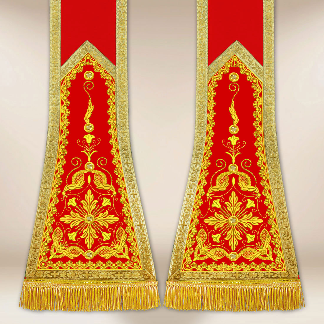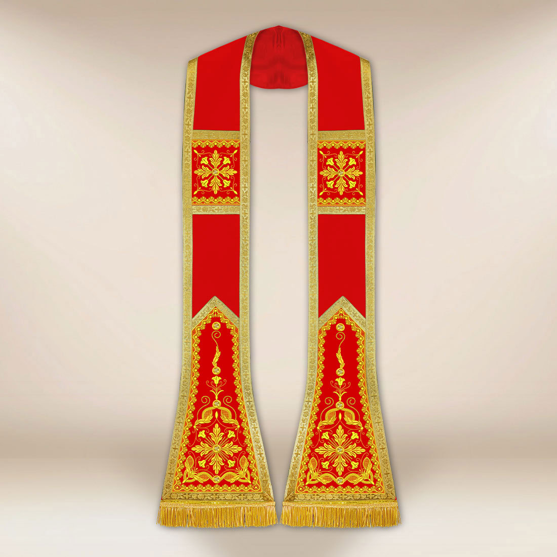 The finishing touches include braided trimmings from an Italian workshop. Its structure creates a decorative rhythm of threads, giving the stole visual coherence and a palpable depth of detail. The red embroidered Roman stole is refined in every element to maintain proportions and balance between decoration and liturgical form. The set includes two collars precisely cut using laser technology, which facilitates the aesthetic arrangement of the stole on the alb and ensures stable adherence to the vestments. This stole is prepared for celebrations that particularly emphasize the beauty and dignity of the liturgy.