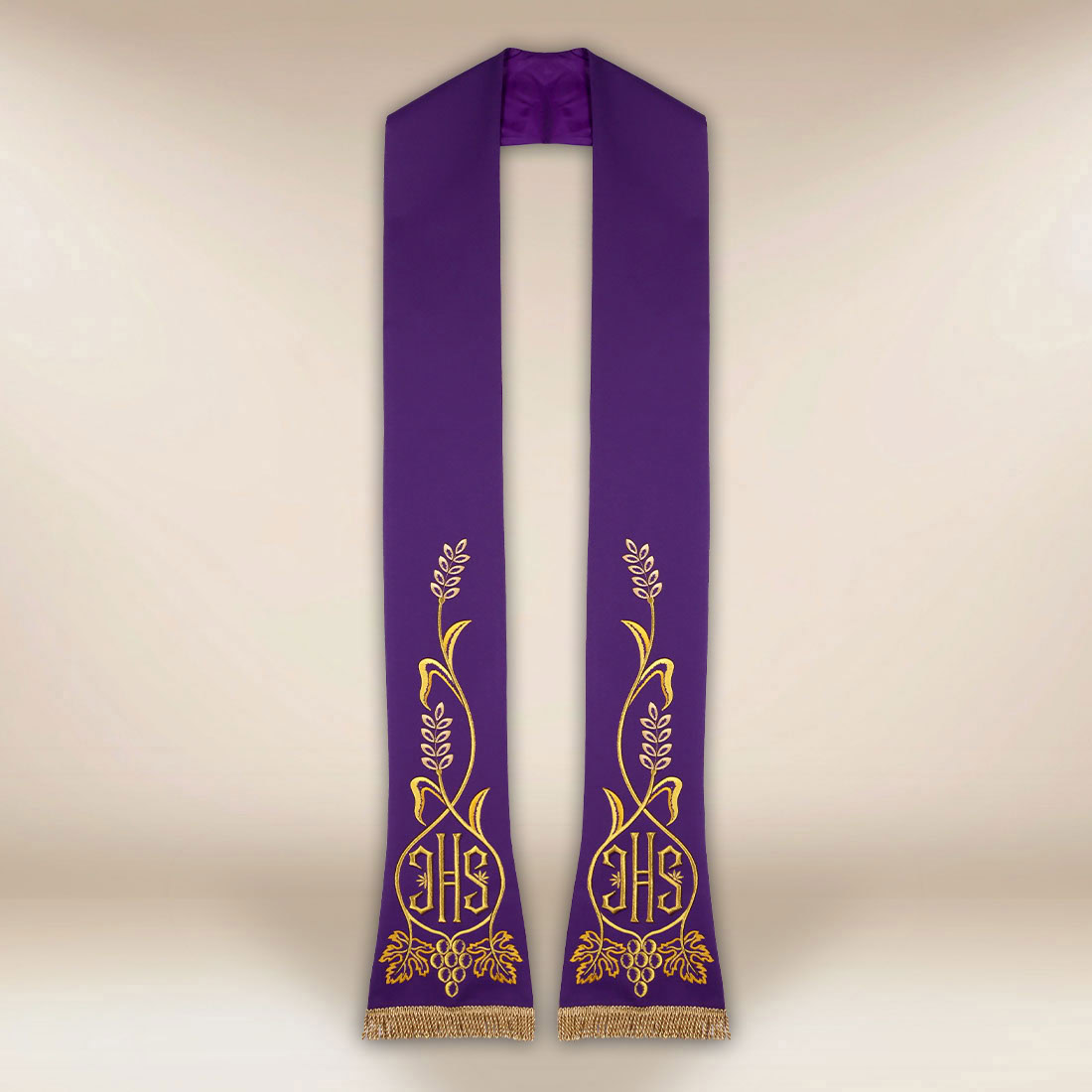 Elegant liturgical stole embroidered with IHS is made from high-quality fabric with a durable and pleasant texture. Adorned with precise eucharistic embroidery IHS and delicate floral ornaments, it emphasizes the solemn character of the celebration. Available in four liturgical colorsred, green, purple, and ecru — it will serve throughout the church year. Classic finishes and fringe give it an elegant appearance. Each stole comes with 2 laser-cut collars, ensuring comfortable and stable placement.