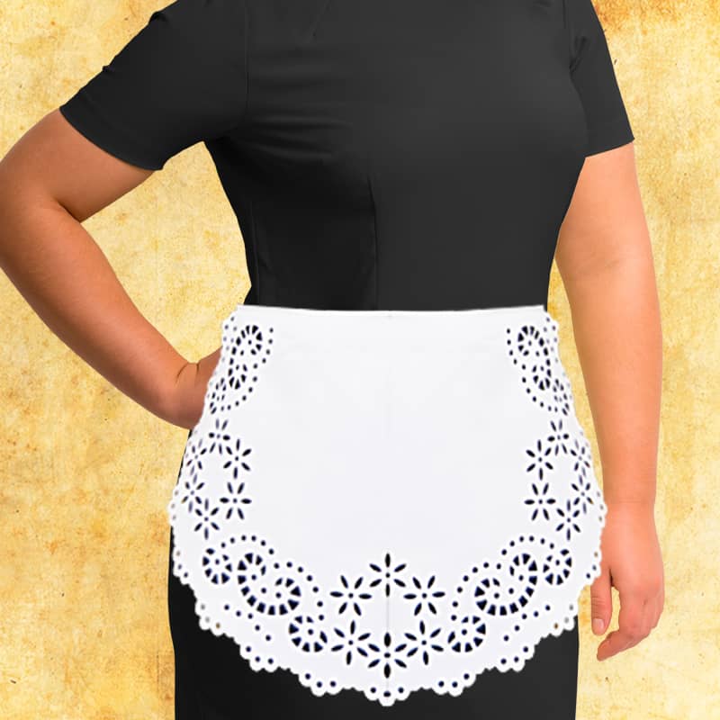 Openwork apron, white Richelieu lace, laser cut. Composition: High-quality 100% polyester, stain-resistant, weight 200 g/m². One size fits all.