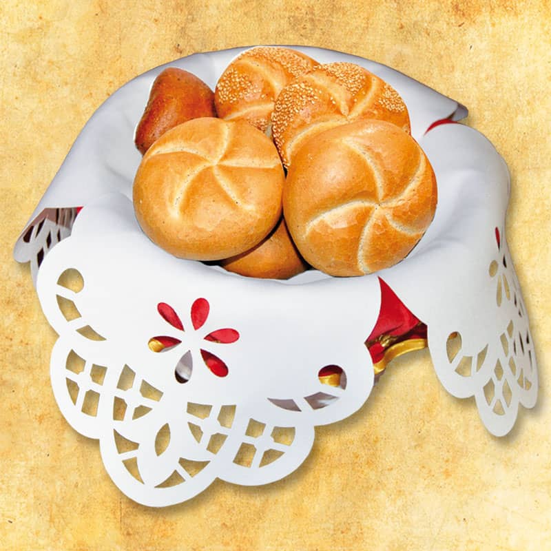 Laser-cut napkin for baskets, bread and other uses. Fabric: stain-resistant, 100% polyester Color: white Size: 40 cm x 40 cm Washing: machine washable at low temperatures
