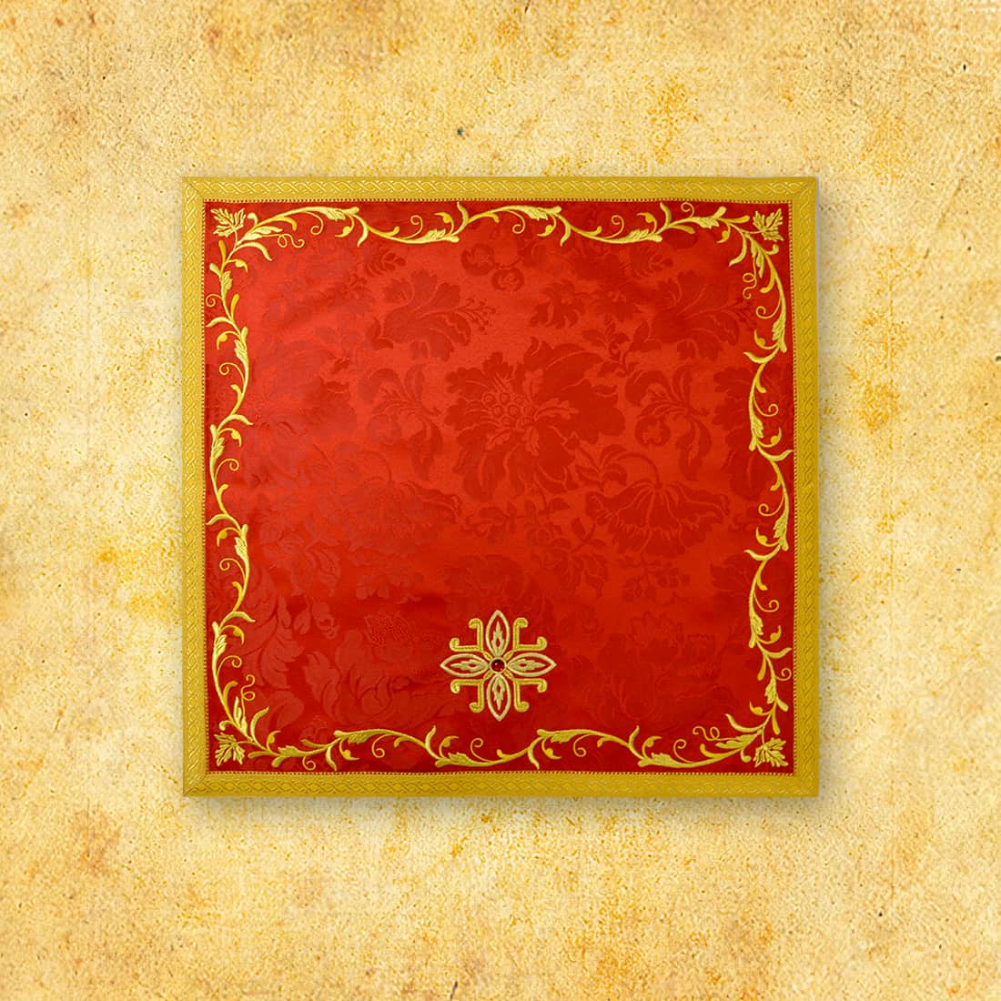 Elegant liturgical veil for a chalice, made of high-quality red jacquard fabric, decorated with a subtle floral pattern.