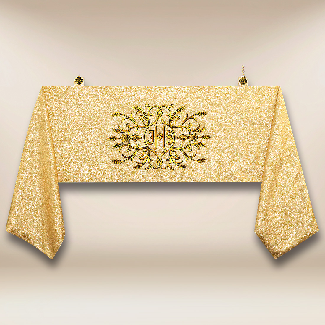 The most important decoration of the veil is the embroidered IHS monogram, surrounded by ornamental plant motifs of a classic liturgical character. The symbolism of IHS – the name Jesus – constitutes the heart of the spiritual content of the veil, emphasizing its purpose for the adoration of the Eucharist and blessings with the Most Holy Sacrament.