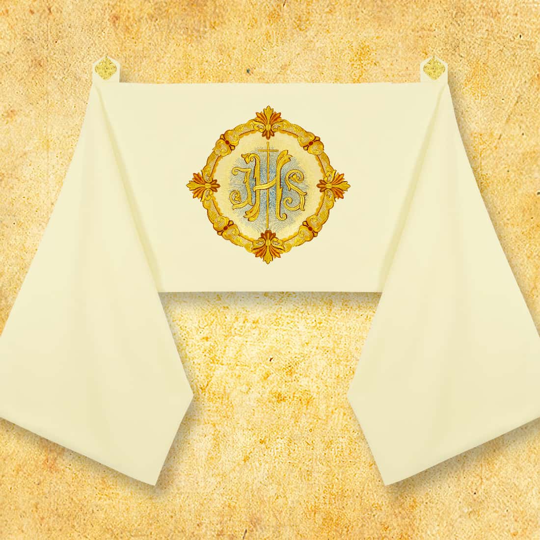 Liturgical veil made of high-quality ecru fabric. Thanks to special tabs with gold buckles sewn onto them, the veil fits very nicely and drapes beautifully on the back. It also has internal pockets. One size fits all.